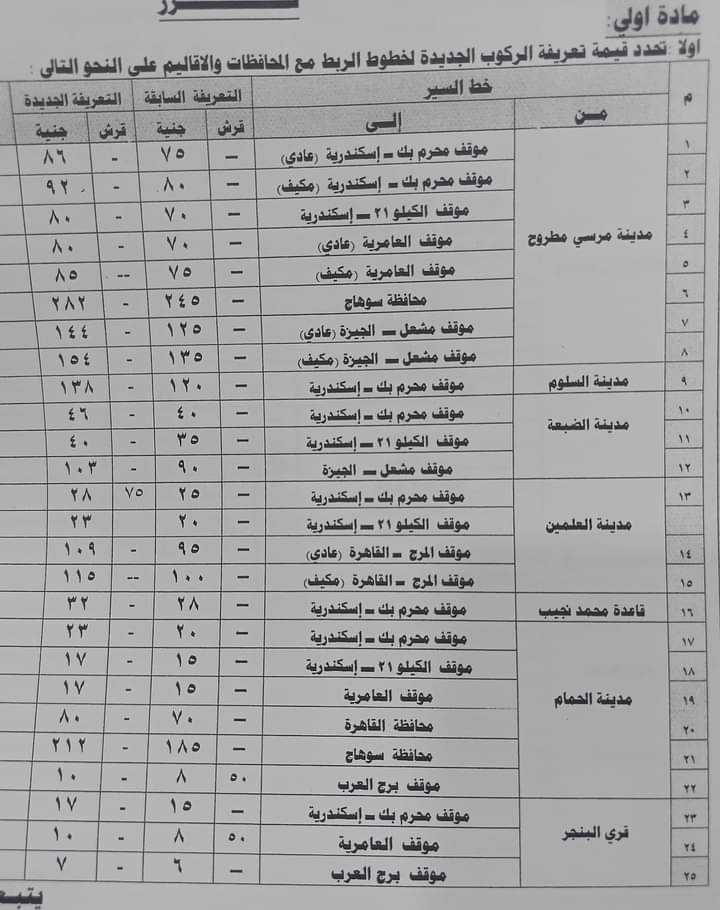 زيادة سعر تعريفة ركوب سيارات الأجرة الداخلية وبين المحافظات 15% بمطروح