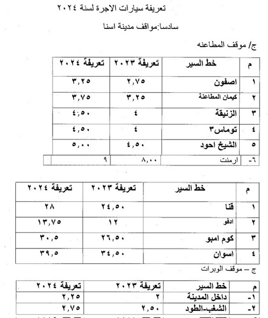 وبلغت الزيادة على تعريفات سيارات الركوب، 25 قرشا على السيرفيس الداخلي لمدينة الأقصر وحتى تصل إلى 14.5 جنيه لمدينة إسنا جنوبا.