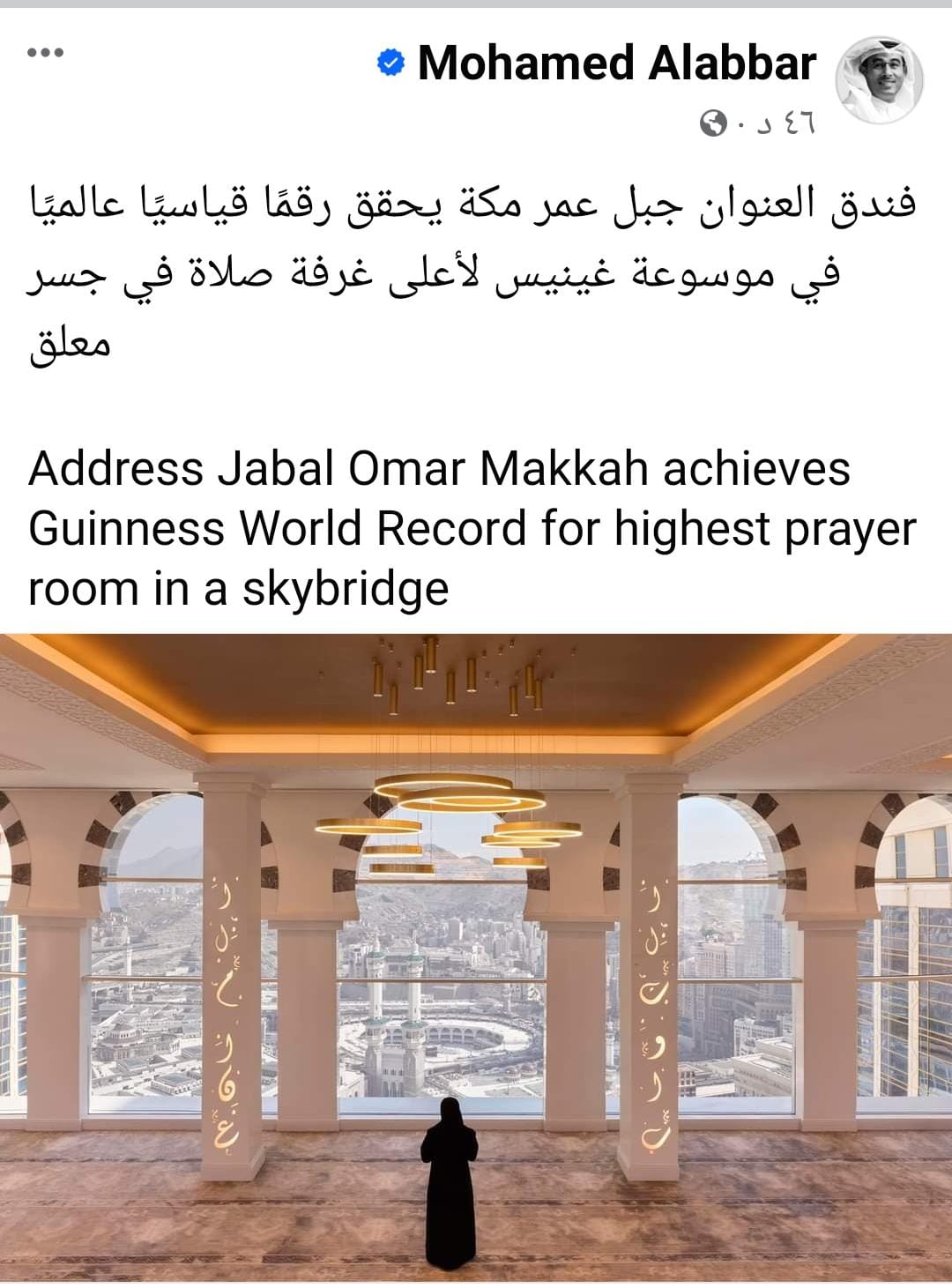 سجل فندق أدرس مكة، المعروف باسم العنوان جبل عمر مكة، التابع لمجموعة إعمار للضيافة، وجهة الضيافة الرائدة في قلب مكة المكرمة، رقما قياسيا عالميا فى موسوعة جينيس، لأعلى غرفة صلاة في جسر معلق.