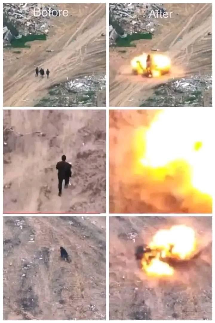 ليفر الشابين الآخرين بسرعة هربًا من صواريخ الاحتلال، لكن يستهدف الاحتلال الشاب الثالث بصاروخ، ليدرك الأخير أنه لا مجال للفرار ويبطئ من حركته، ليقتل بالرصاص ثم يطلق عليه صاروخ.