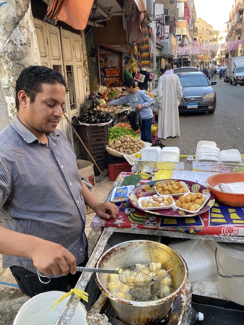 يقف بتروسيكل صغير بشارع المدينة وسط مدينة الأقصر، ويقول عنه أهالي الأقصر إن العجينة في إيده حرير وهو الشاب الأقصري الذي تفنن في صناعة الزلابية.