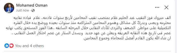 وأضاف خلال منشور له عبر صفحته الرسمية على فيس بوك: ألف مبروك فوز النقيب عبد الحليم علام بمنصب نقيب المحامين لأربع سنوات قادمة.. علام قيادة نقابية محترمة ويعني ويدرك كل مشاكل وهموم المحامين المتراكمة منذ سنوات بعيدة، ووضع يده خلال الفترة التكميلية على مواطن الضعف والتردى للآداء النقابي خلال المرحله السابقه.. هذا الفوز المستحق يكتب نهايه عصر في تاريخ هذه النقابة العريقة، ويعلن عن عهد جديد ويسدل الستار عن عصر احتكار العمل النقابي.. إن شاء الله يكون القادم أفضل للمحاماة وجموع المحامين.