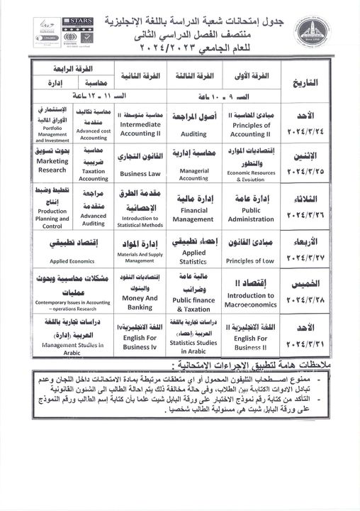 وينشر القاهرة 24، جداول امتحانات الميدتيرم للفصل الدراسي الثاني 2024 لطلاب كلية التجارة بجامعة عين شمس في السطور التالية، والتي جاءت كما يلي: