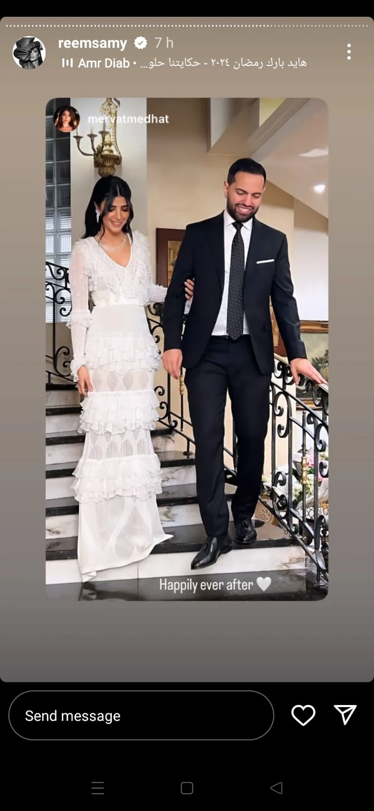 واكتفت ريم سامي بحفل بسيط، وظهرت بإطلالة رقيقة، مرتدية فستانا أبيض مميز ومختلف، وعقد القران الشيخ خالد الجندي.