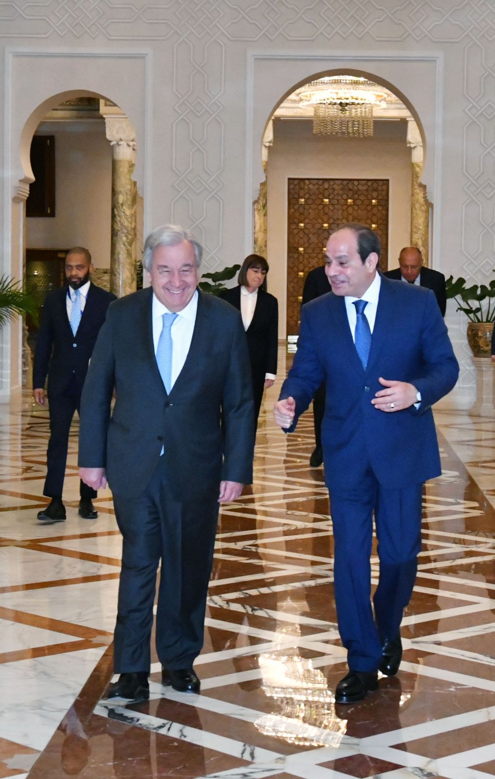 وذكر المتحدث الرسمي أن اللقاء شهد تطابقا في المواقف بشأن خطورة الموقف وضرورة تجنب تغذية العوامل المؤدية لاتساع نطاق الصراع، وكذلك الرفض التام والقاطع لتهجير الفلسطينيين من أراضيهم، ورفض والتحذير من أي عملية عسكرية في رفح الفلسطينية، بما لها من تبعات كارثية على الوضع المتدهور بالفعل، كما شدد الرئيس والسكرتير العام للأمم المتحدة على حتمية حل الدولتين كمسار وحيد لتحقيق العدل والأمن والاستقرار بالمنطقة وضرورة تهيئة الظروف الملائمة لتفعيله.