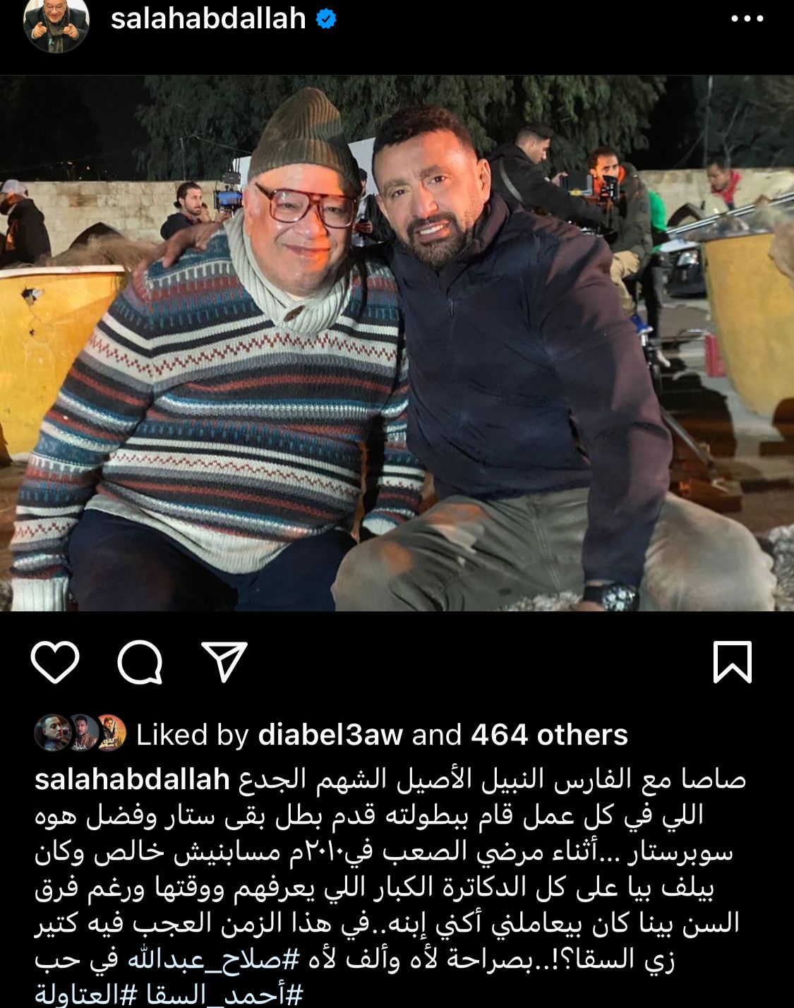 ونشر صلاح عبدالله صورة له رفقة الفنان أحمد السقا، وعلق عليها قائلا: صاصا مع الفارس النبيل الأصيل الشهم الجدع، اللي في كل عمل قام ببطولته قدم بطل بقى ستار، وفضل هوه سوبرستار.