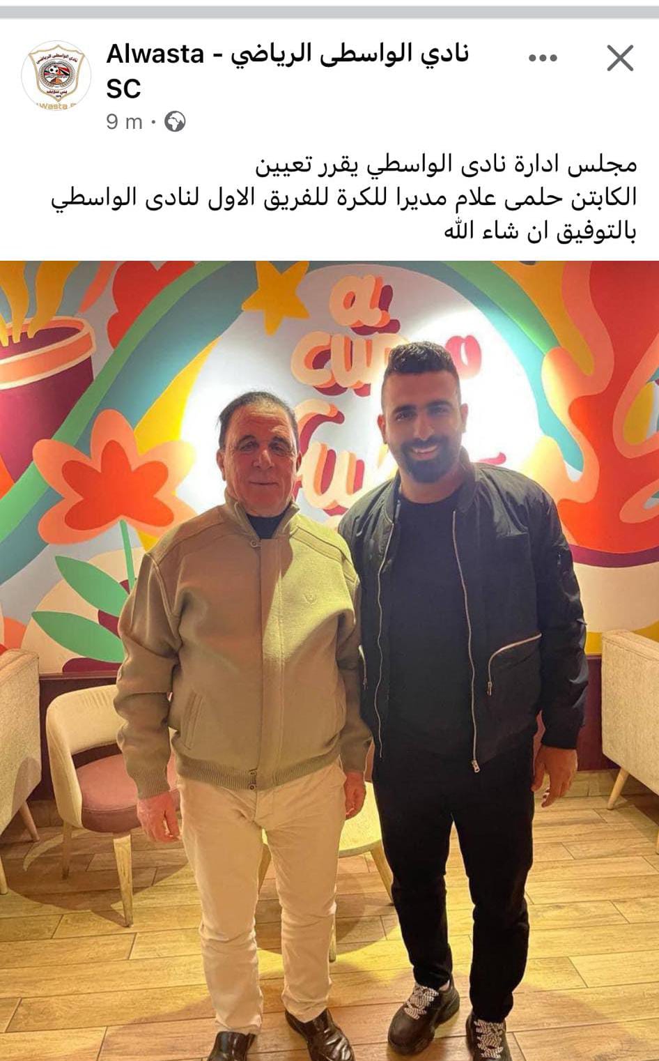 ونشرت الصفحة الرسمية لنادي الواسطى على موقع التواصل الاجتماعي فيسبوك، صورة جمال عويس رئيس النادي وبجواره حلمي علام، وعلقت عليها قائلة: مجلس إدارة نادي الواسطى يقرر تعيين الكابتن حلمي علام مديرا للكرة للفريق الأول لنادي الواسطى بالتوفيق إن شاء الله.