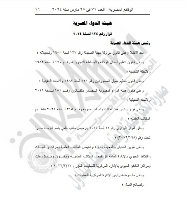 وقالت الجريدة الرسمية، إن المادة الأولى تنص على إلغاء ترخيص إنشاء المكتب العلمي فارما سي ومخزن العينات التابع له ومقره فيلا رقم 101 المنطقة الثالثة- الحي الأول- التجمع الخامس- القاهرة، ومخزن العينات: فيلا رقم 101 المنطقة الثالثة - الحي الأول - التجمع الخامس - القاهرة.