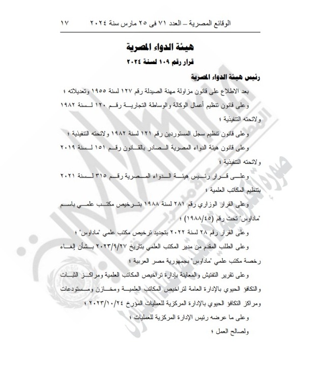 كما نشرت الجريدة الرسمية، القرار الثاني لهيئة الدواء المصرية، بشأن إلغاء ترخيص إنشاء المكتب العلمي ماداوس بالقاهرة، حيث جاء ذلك بعد الإطلاع على قانون مزاولة مهنة الصيدلة رقم 127 لسنة 1955 وتعديلاته، وعلى قانون تنظيم أعمال الوكالة والوساطة التجارية رقم 120 لسنة 1982 ولائحته التنفيذية، وعلى قانون تنظيم سجل المستوردين رقم 121 لسنة 1982 ولائحته التنفيذية، وعلى قانون هيئة الدواء المصرية الصادر بالقانون رقم 151 لسنة 2019 ولائحته التنفيذية.