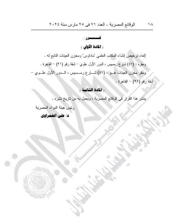 وأضافت الجريدة الرسمية، أن المادة الأولى لهذا القرار نصت على إلغاء ترخيص إنشاء المكتب العلمي ماداوس ومخزن العينات التابع له ومقره 47 شارع رمسيس - الدور الأول علوي - بالقاهرة.
