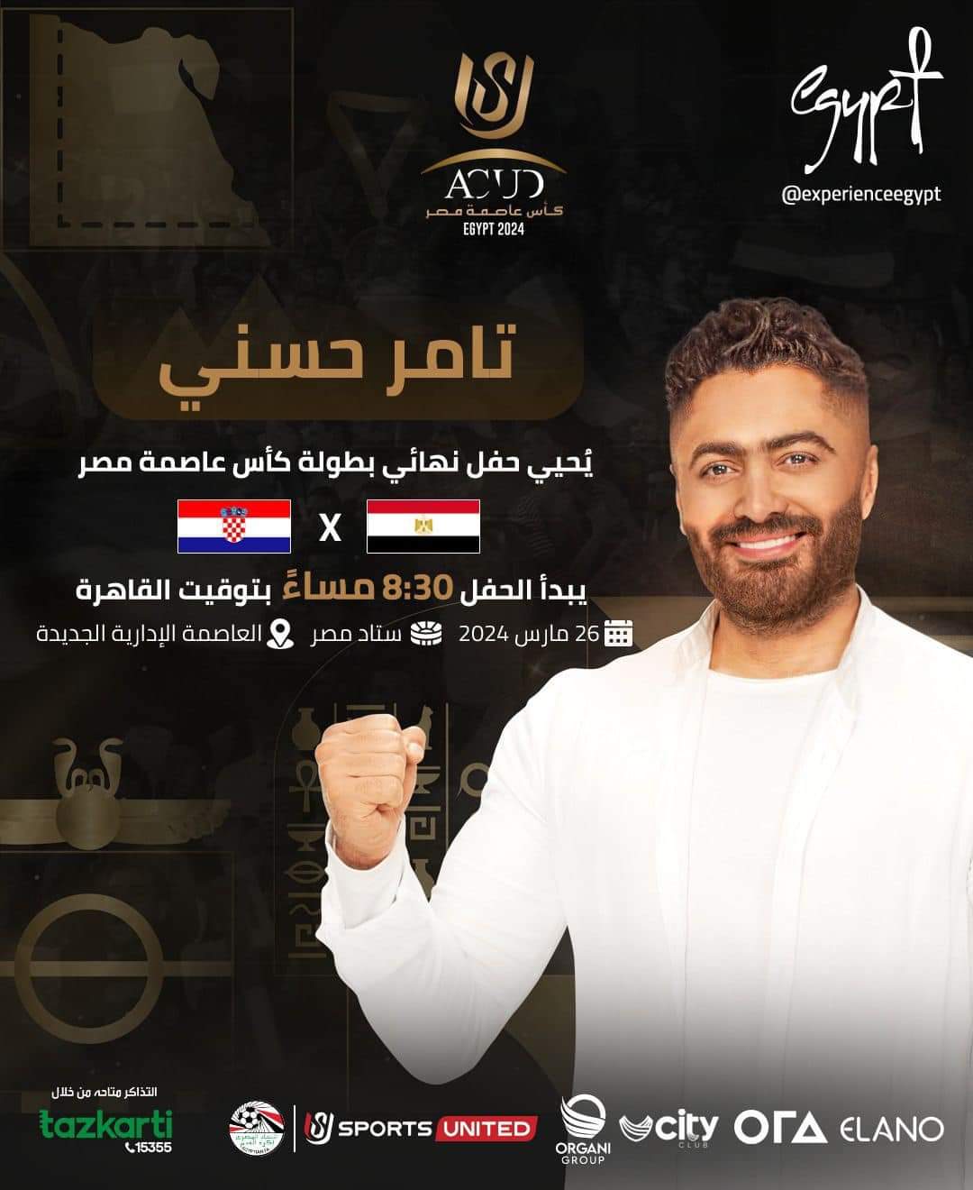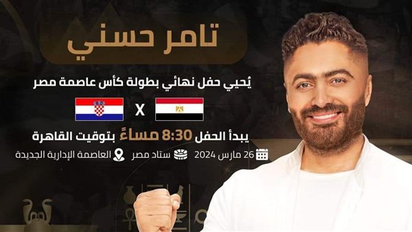 ومن جانبه نشر تامر حسني، إعلان إحيائه حفل نهائي كأس العاصمة بين مصر وكرواتيا، المقرر إقامته غدا الثلاثاء في تمام الساعة 8:30 مساء بتوقيت مصر، قبل انطلاق المباراة.