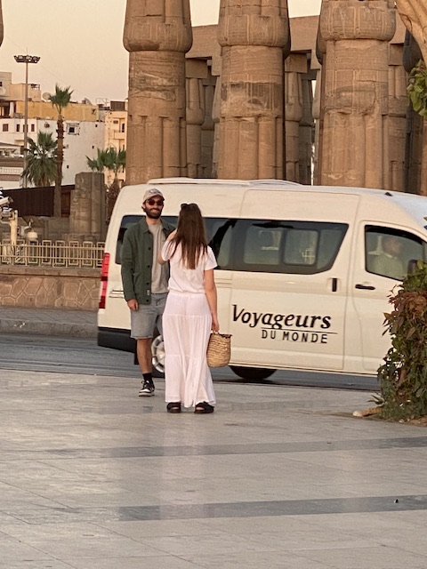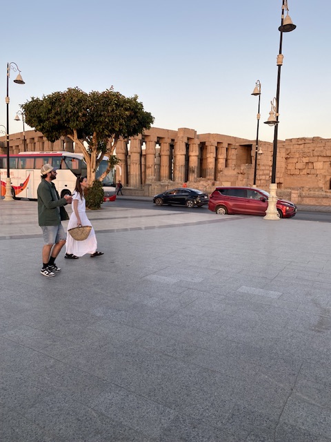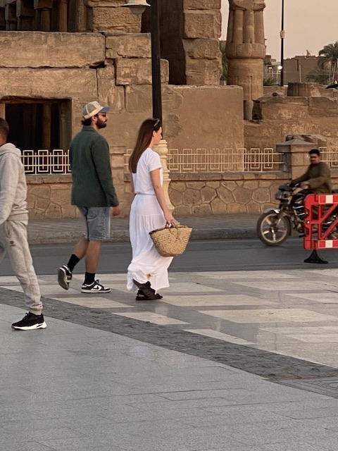 ويبدو أن السائحة قد بهرتها الألوان الموجودة بها فأخذت تتجول بها على كورنيش الأقصر ملتقطة العديد من الصور مع صديقها وهي تحتضن القفة أو حقيبتها الجديدة وهي سعيدة بها.