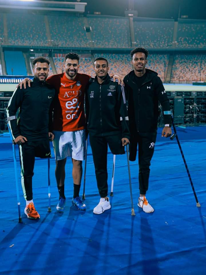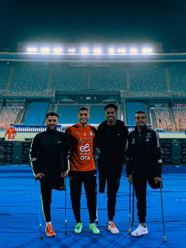 التوأم ولاعبو المنتخب يستقبلون فريق الساق الواحد في استاد القاهرة| صور