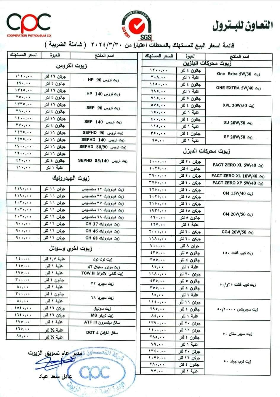 قررت شركة التعاون للبترول زيادة أسعار بعض منتجاتها، من زيوت محركات البنزين ومحركات الديزل وزيوت التروس والهيدروليك، اعتبارًا من الغد السبت الموافق 30 مارس 2024.