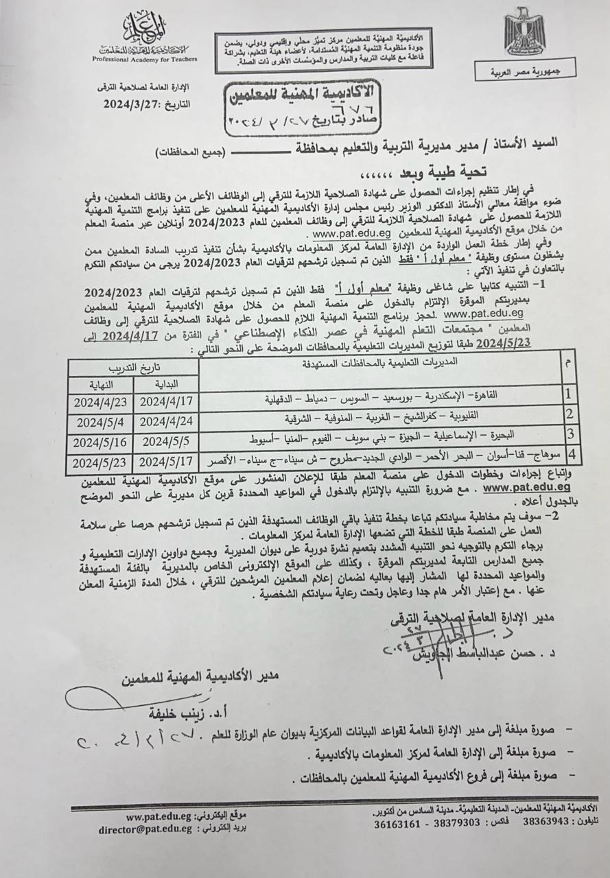 وأوضحت، أنه يأتي في إطار تنظيم إجراءات الحصول على شهادة الصلاحية اللازمة للترقي إلى الوظائف الأعلى من وظائف المعلمين، وفي ضوء موافقة وزير التربية والتعليم والتعليم الفني رئيس مجلس إدارة الأكاديمية المهنية للمعلمين، على تنفيذ برامج التنمية المهنية اللازمة للحصول على شهادة الصلاحية اللازمة للترقي إلى وظائف المعلمين للعام 2024/2023 أونلاين عبر منصة المعلم من خلال موقع الأكاديمية المهنية للمعلمين، وتنفيذا لخطة العمل الواردة من الإدارة العامة لمركز المعلومات بالأكاديمية بشأن تنفيذ تدريب المعلمين ممن يشغلون مستوى وظيفة معلم أول أ فقط الذين تم تسجيل ترشحهم لترقيات العام 2024/2023.