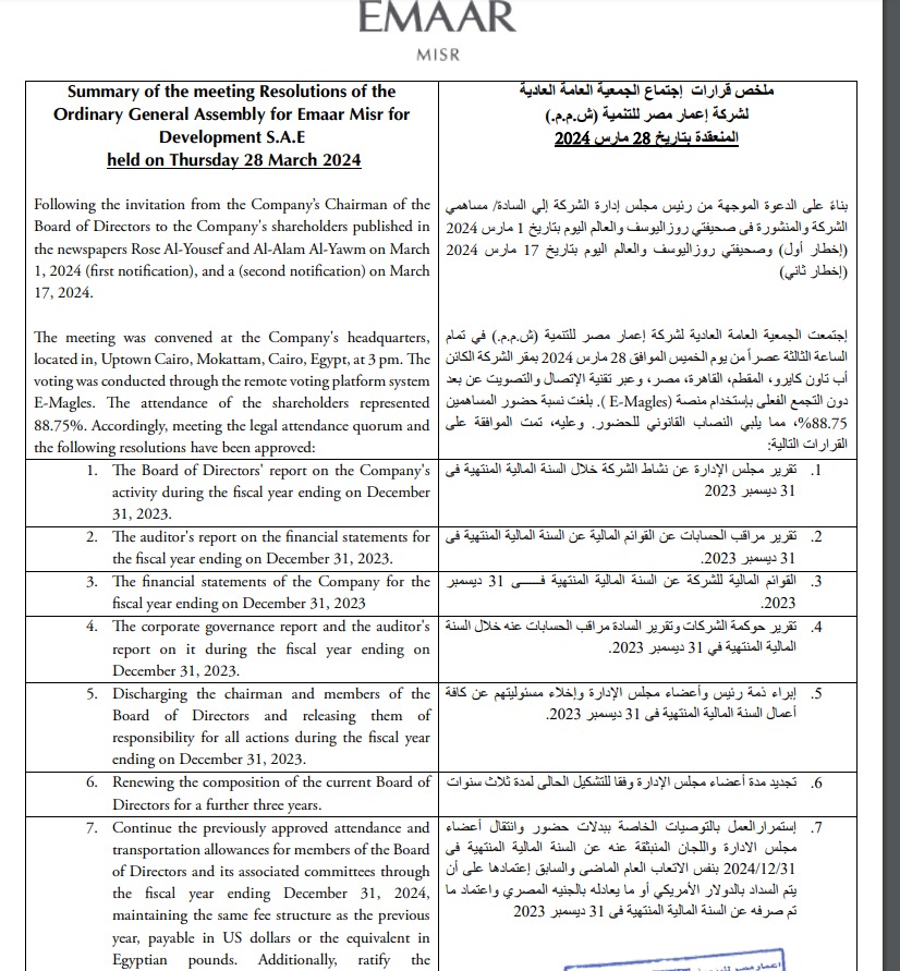 وافقت الجمعية العادية لشركة إعمار مصر للتنمية، على تجديد مدة أعضاء مجلس الإدارة وفقًا للتشكيل الحالي لمدة ثلاث سنوات.
