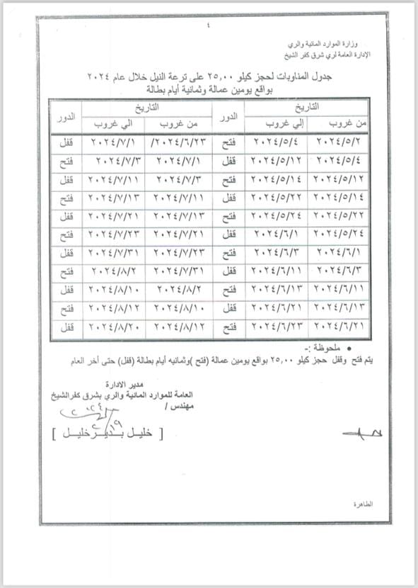 وأضافت الإدارة المركزية للموارد المائية والري بمحافظة كفر الشيخ، أن الأيام الواقعة بين تغير الأدوار هي الأيام المخصصة لملئ الأحباس، علي أن يتم فتح وقفل حجز كيلو 25000 بواقع يومين عمالة فتح وثمانية أيام بطالة وقفل حتى آخر العام.