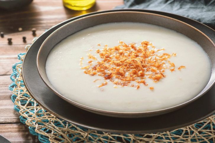 - استمري في تقليب الكشك بالمضرب حتى يثقل قوامه ثم ضعيه في أطباق التقديم وزيني الكشك بالبصل المحمر.