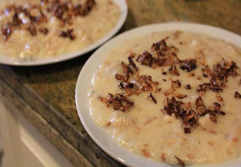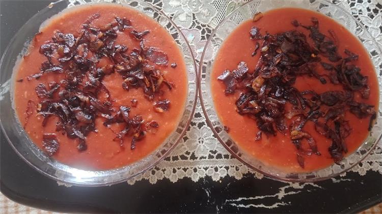 - بعد أن تحصلي على قوام الكشك المطلوب ضعيه في الأطباق وزينيه بالبصل المحمر المقرمش وبألف هنا.