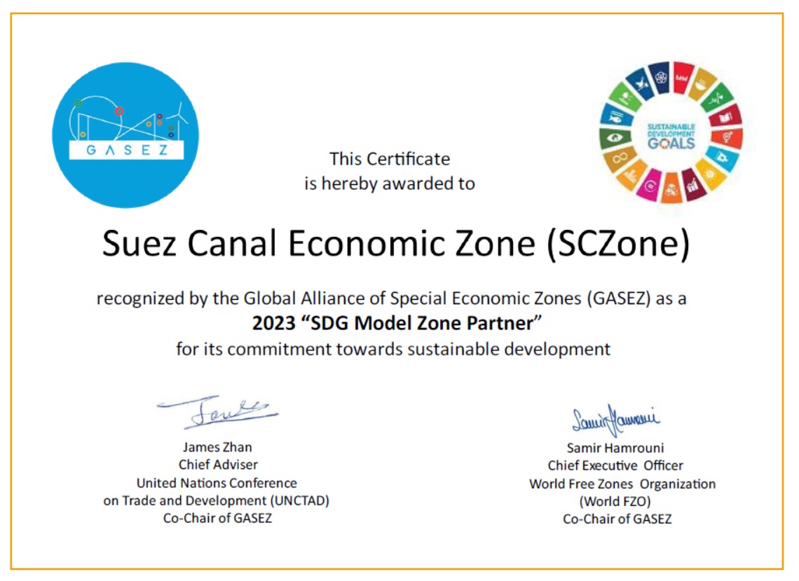 حصلت المنطقة الاقتصادية لقناة السويس على شهادة شراكة نموذج أهداف التنمية المستدامة للمناطق الاقتصادية SDG Model Zone Partner من التحالف العالمي للمناطق الاقتصادية الخاصة Global Alliance of Special Economic Zones “GASEZ”، وقد تم الإعلان عن هذا التصنيف خلال منتدى الاستثمار العالمي لمؤتمر الأمم المتحدة للتجارة والتنمية The United Nations Conference on Trade and Development “UNCTAD”، الذي أقيم بدولة الإمارات العربية المتحدة في أكتوبر 2023، والمؤتمر الثاني للتحالف العالمي للمناطق الاقتصادية الخاصة “GASEZ” الذي أقيم بمدينة برشلونة بإسبانيا في 9 نوفمبر 2023.