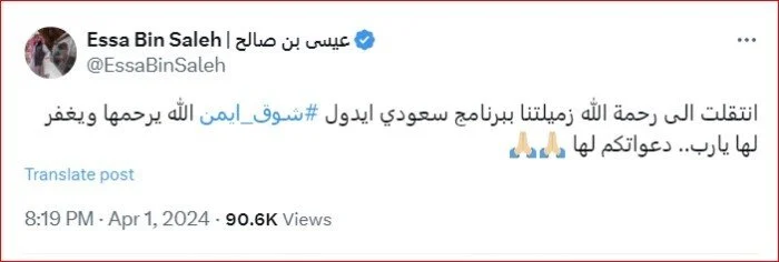 وكتب عيسى بن صالح عبر حسابه الشخصي على موقع التغريدات إكس تويتر سابقًا، قائلًا: انتقلت إلى رحمة الله زميلتنا ببرنامج سعودي آيدول شوق أيمن، الله يرحمها ويغفر لها يارب.. دعواتكم لها.