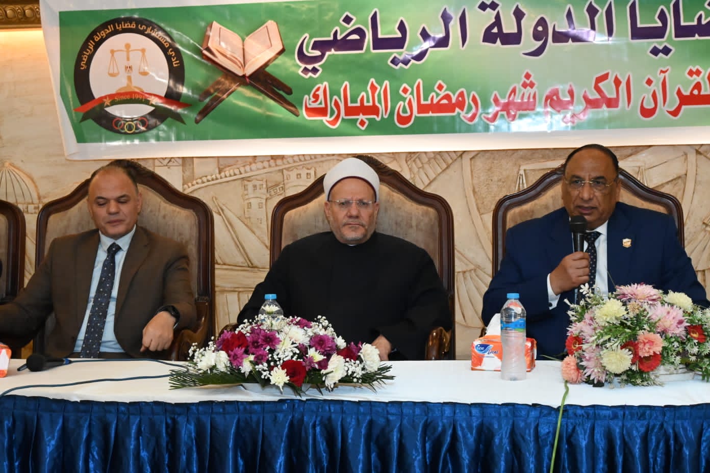 وألقى الشيخ مفتي الديار المصرية والإعلامي رئيس اذاعه القران الكريم كلمه من خلالها بينا فضل حفظ القران، وكيف نجعله منهاجا وحياه، وقد رحب الوزير رئيس الهيئة بجميع الضيوف، واثني علي أعضاء مجلس اداره النادي الرياضي، وطلب منهم المزيد من النجاح والجهد، وفي نهاية الحفل استمتع الحضور بالأناشيد الدينية والتواشيح في جو رمضاني جميل.
