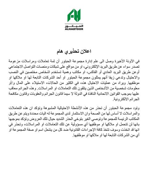 وقالت المجموعة في بيان نشره رجل الأعمال خلف الحبتور"في الآونة الأخيرة وصل الى علم إدارة مجموعة الحبتور أن ثمة تعاملات ومراسلات مزعومة تصدر سواء عن طريق البريد الإلكتروني، أو من مواقع على شبكات ومنصات التواصل الاجتماعي أو عن طريق البريد العادي أو الفاكس أو مكاتب وهمية تستخدم اشخاص مختصين في النصب والاحتيال وتدعي زيفًا أنهم يمثلون مجموعة الحبتور أو أحد الشركات التابعة لها أو ملاكها أو موظفيها".