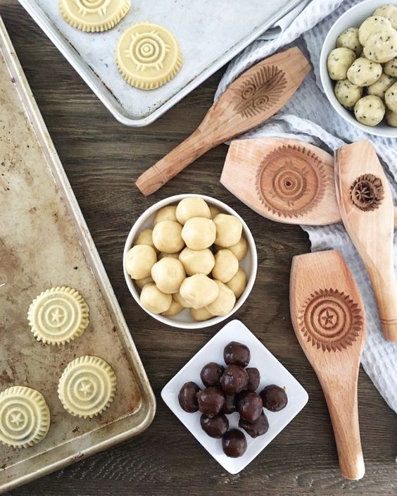 - بعد الانتهاء من تشكيل كل عجينة البسكويت، خذي خلة أسنان واضغطي بخفة على منتصف البسكويت.