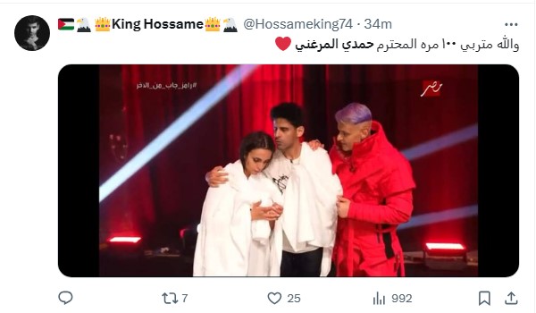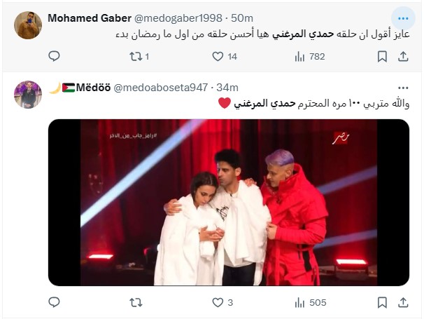 وشارك مُغردو إكس صور ومقاطع من حلقة الفنان حمدي المرغني وزوجته إسراء، مُعبرين عن شدة إعجابهم بأخلاقه وحبه وامتنانه لزوجته التي اتهمها رامز جلال خلال مقلبه بأنها أنفقت كل ما لدى حمدي من أموال، وعلق أحد المُغردين كاتبًا: والله متربي 100 مرة المحترم حمدي المرغني، ومتابع آخر شارك مازحًا حمدي المرغني طول الحلقة.. متخافيش أنا معاكي.