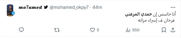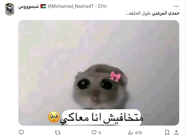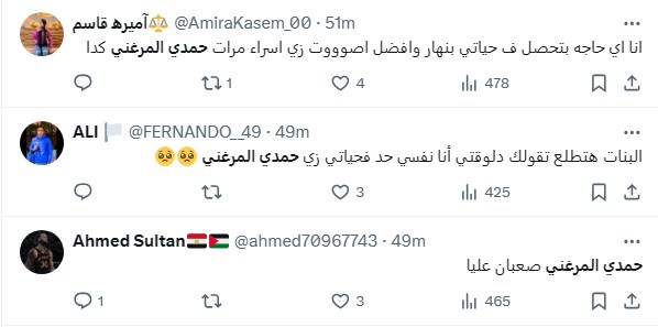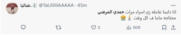 ومتابعة تشارك بتغريدة، قائلة: أنا دايمًا عاملة زي إسراء زوجة حمدي المرغني.. محتاجة ماما في كل وقت، ومتابعة أخرى: أنا أي حاجة بتحصل في حياتي بنهار وأفضل أصوت زي إسراء مرات حمدي المرغني كدة.