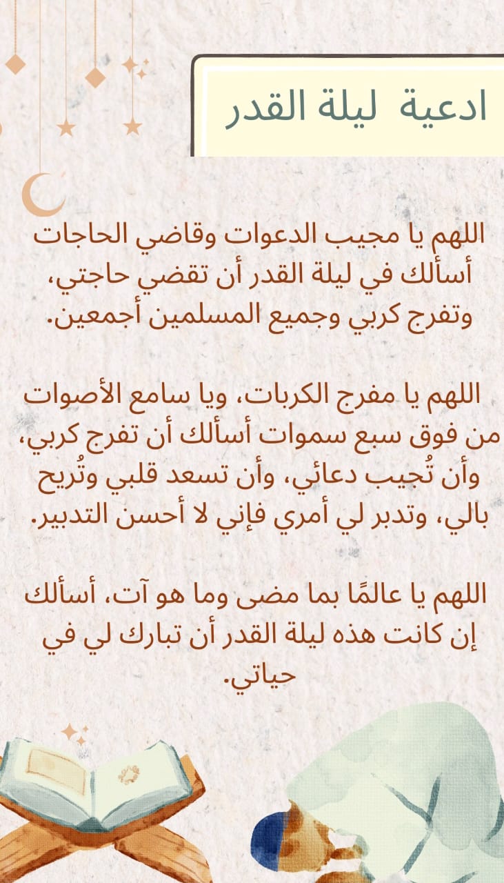 - اللهم إن كانت هذه ليلة القدر فاقسم لي فيها خير ما قسمت واختم لي في قضائك خير ما ختمت واختم لي بالسعادة فيمن ختمت.