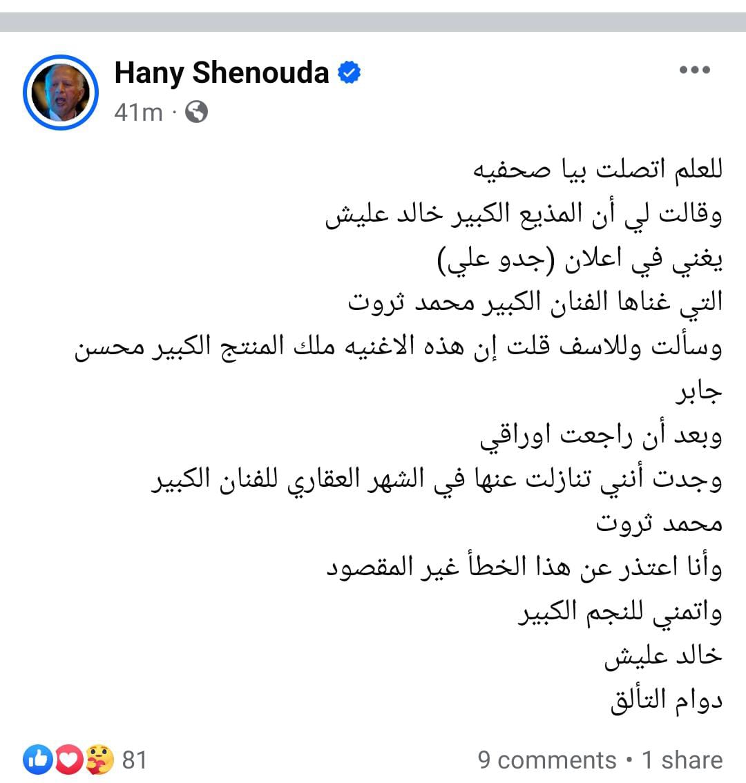 وأضاف شنودة: وسألت وللأسف قلت إن هذه الأغنية ملك المنتج الكبير محسن جابر وبعد أن راجعت أوراقي.. وجدت أنني تنازلت عنها في الشهر العقاري للفنان الكبير محمد ثروت، وأنا اعتذر عن هذا الخطأ غير المقصود وأتمنى للنجم الكبير خالد عليش دوام التألق.