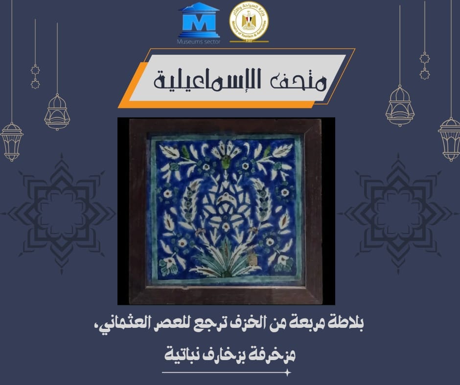 يعرض متحف آثار الإسماعيلية بعد الانتهاء من عملية ترميمه بلاطة مربعة من الخزف ترجع للعصر العثماني، مزخرفة بزخارف نباتية باللون الأبيض، والأزرق، والأصفر.