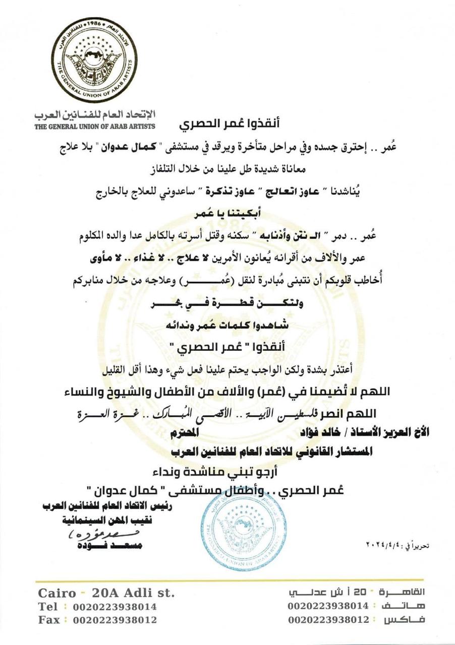 وأضاف المخرج مسعد فودة في بيان له: عمر قتلت أسرته بالكامل عدا والده المكلوم، الآلاف من أقرانه يُعانون الأمرين لا علاج.. لا غذاء.. لا مأوى أخاطب قلوبكم أن نتبنى مبادرة لنقل عمر وعلاجه من خلال منابركم، متابعًا: ولتكن قطرة في بحر شاهدوا كلمات عمر وندائه أنقذوا عمر الحصري.