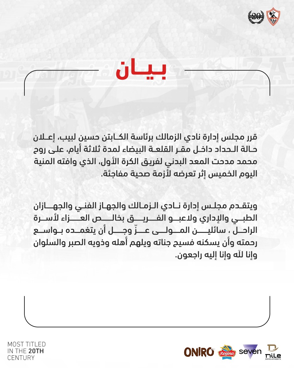 قرر مجلس إدارة نادي الزمالك برئاسة حسين لبيب، إعلان حالة الحداد داخل مقر القلعة البيضاء لمدة ثلاثة أيام، على روح محمد مدحت المعد البدني لفريق الكرة الأول، الذي وافته المنية مساء أمس الخميس إثر تعرضه لأزمة صحية مفاجئة.