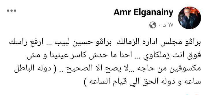 وكتب عمرو الجنايني عبر حسابه الرسمي على فيس بوك: براڤو مجلس إدارة الزمالك، براڤو حسين لبيب.. ارفع راسك فوق إنت زملكاوي.. إحنا ماحدش كاسر عينينا ومش مكسوفين من حاجة.. لا يصح إلا الصحيح.. دولة الباطل ساعة ودولة الحق إلى قيام الساعة.