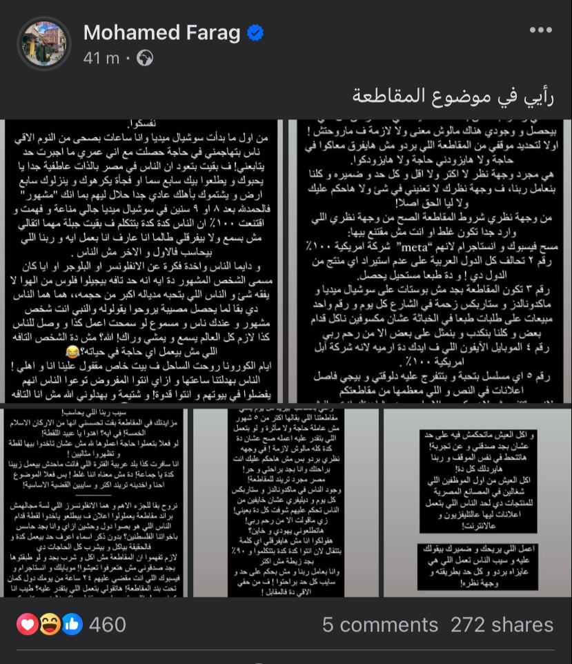واختتم فرج، تحديد موقفي من المقاطعة اللي بردو مش هيفرق معاكوا في حاجة ولا يزودني حاجة ولا هيزودكوا، هي مجرد وجهة نظر لا أكثر ولا أقل، وكل واحد وضميره وكلنا بنعامل ربنا، ووجهة نظرك لا تعنيني في شيء ولا هحكم عليك ولا ليا الحق أصلا.