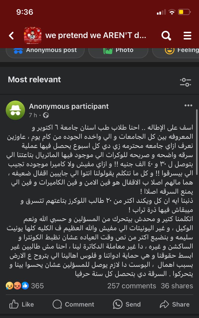 وتساءل أحد الطلاب، في منشور على أحد الجروبات الخاصة بكلية طب الأسنان بجامعة 6 أكتوبر: عايزين نعرف إزاي جامعة محترمة زي دي، كل أسبوع يحصل فيها عملية سرقة واضحة وصريحة للماتاريل بتاعنا، اللي بيوصل لـ 30 و40 ألف جنيه، وإزاي مفيش كاميرات موجودة تجيب السارق؟.