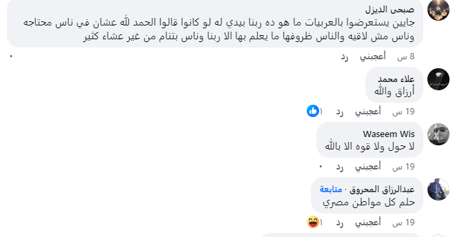 فجاءت التعليقات على الصورة، التي نشرها عمر كمال كالتالي: إحنا في زمن الهيافة والجهل والمرض هو اللي بيسود، أرزاق والله، حلم كل مواطن مصري، وذو جهل قد ينام على حرير وذو علم مفارشة التراب، ربنا يبارك فيكم ويحفظكم من كل سوء، ربنا يهدي، محدثين نعمة، الفشل أصبح حلم كل ناجح، زمن اللي يتعب وياخد شهادة يبقا راكب عربية 128، واللي بيرقص يركب مرسيدس.