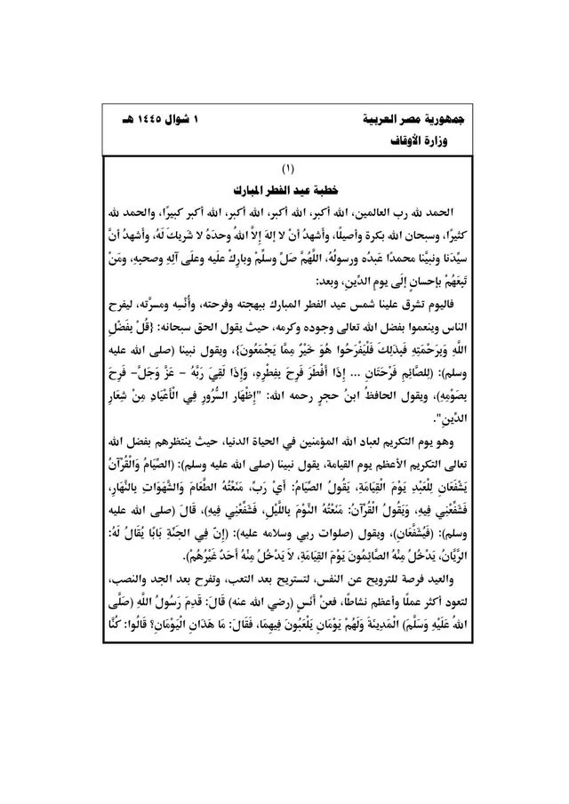 ونعرض فيما يلي خطبة عيد الفطر مكتوبة pdf وفقا لما نشرته وزارة الأوقاف، إذ تكون خطبة عيد الفطر 2024 كخطبة الجمعة، يخطب الإمام خطبتين قصيرتين يفصل بينهما بالجلوس.