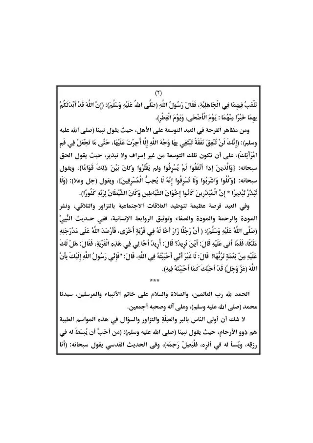 وفي العيد فرصة عظيمة لتوطيد العلاقات الاجتماعية بالتزاور والتلاقي ونشر المودة والرحمة والمودة والصفاء وتوثيق الروابط الإنسانية، ففي حديث النبي صلَّى اللهُ عَلَيْهِ وَسَلَّمَ: "أَنْ رَجُلًا زَارَ أَخَا لَهُ فِي قَرْيَةٍ أُخْرَى، فَأَرْصَدَ اللَّهُ عَلَى مَدْرَجَتِهِ مَلَكًا، فَلَمَّا أَتَى عَلَيْهِ قَالَ: أَيْنَ تُرِيدُ؟ قَالَ: أُرِيدُ أَخَالِي فِي هَذِهِ الْقَرْيَةِ، فَقَالَ: هَلْ لَكَ عَلَيْهِ مِنْ نِعْمَةٍ تَرَبُّهَا قَالَ: لَا غَيْرَ أَنِّي أَحْبَبْتُهُ فِي اللهِ، قَالَ: "فَإِنِّي رَسُولُ اللَّهِ إِلَيْكَ بِأَنْ اللهَ عَزَّ وَجَلَّ قَدْ أَحَبُّكَ كَمَا أَحْبَبْتَهُ فِيهِ".