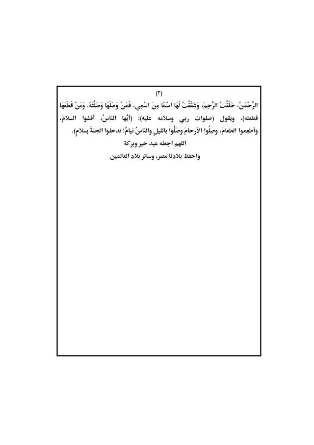 ويقول صلوات ربي وسلامه عليه "أيها الناس أفشوا السلام وأطعموا الطعام، وصِلوا الأرحام وصَلوا بالليل والناس نيام تدخلوا الجنة بسلام".