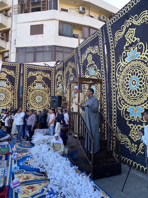 وأعتلى المنبر والذي يقام لأول مرة بالساحة ملقيا خطبة العيد إمام وخطيب مسجد أبو الحجاج الشيخ مبارك على الرفاعي بعد إمامته للصلاة والتي بدأت الساعة 5:56 بتوقيت الأقصر، حيث تم استخدام مترجم بلغة الإشارة لترجمة الخطبة.