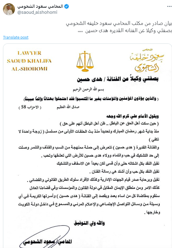 وأضاف: نقبل النقد بكل أشكاله حتى وإن قسى لكن بعيدًا عن الإسفاف والتشكيك، نقبل النقد بكل حب وإن اشتد هي رسالة الفنان، نقبل وبرحابة صدر قيام الجهات الإدارية وكذلك الأفراد سلوك الطريق القانوني والقضائي، كذلك الأمر ومن منطلق الإيمان المقابل في دولة القانون والمؤسسات وفي قضاءنا العادل سنقاضي كل من إساء بعمد وبقصد إلى الفنانة هدى حسين وأسرتها الكريمة في أي وسيلة من وسائل التواصل الاجتماعي والإعلام المرئي والمسموع في داخل دولة الكويت وخارجها.