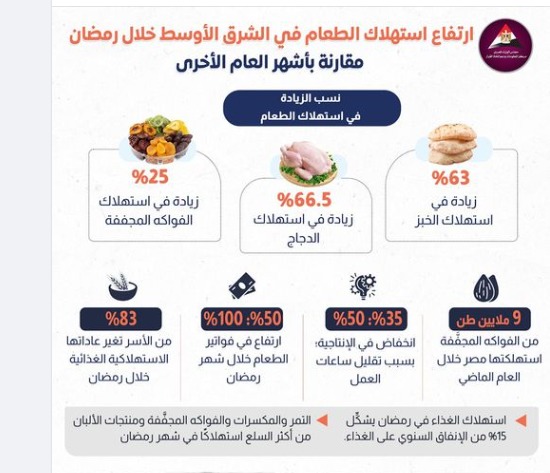 وفيما يتعلق بمعدلات الاستهلاك في دول الشرق الأوسط، أشار معلومات الوزراء إلى ارتفاع استهلاك الطعام في الشرق الأوسط خلال رمضان مقارنة بأشهر العام الأخرى ليسجل استهلاك الخبز زيادة قدرها 63%.