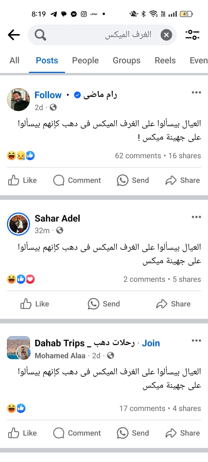وعلق أحد مُتابعي وسائل التواصل الاجتماعي، قائلًا: العيال بيسألوا على الغرف الميكس في دهب كأنهم بيسألوا على عصير ميكس، وعقب مُتابع آخر ساخرًا بصورة الفنان سيد رجب بملامحه المستاءة، كاتبًا: لما العميل ييجي يسألني على غرف ميكس، مما يوضح قيام الأطفال والمُراهقين بطلب غرف الميكس، أو المزدوجة للجنسين داخل الفنادق خلال قضاء إجازة أيام عيد الفطر المبارك لعام 2024، خاصًة بالتزامن مع إجازات العمل والمدارس والجامعات، مما يزيد من رغبة الجميع في قضاء وقت ممتع في الأماكن السياحية.