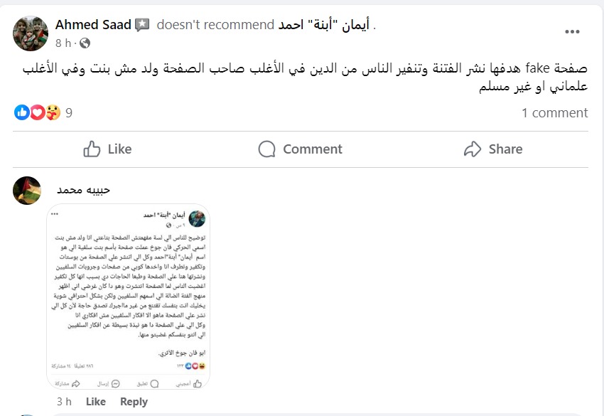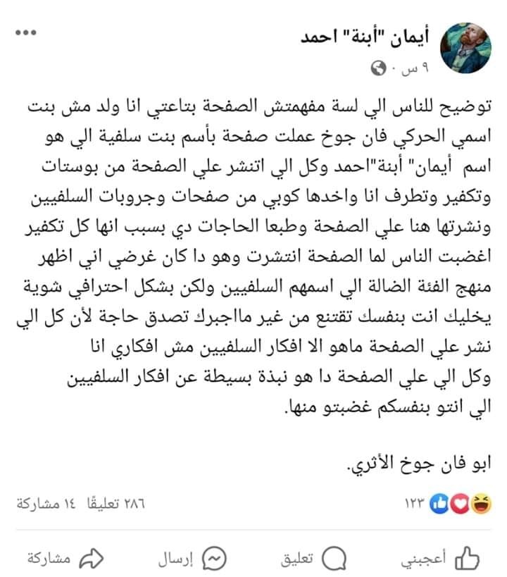 نشر حساب عبر موقع التواصل الاجتماعي فيسبوك، يحمل اسم إيمان ابنة أحمد وصورة لفتاة منتقبة، عدد من المنشورات الدينية المثيرة للجدل، والتي تفاعل معها مستخدمي مواقع التواصل الاجتماعي بشكل كبير.