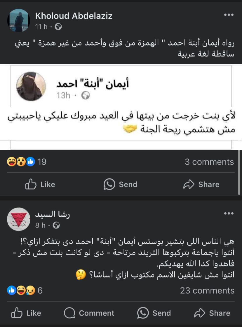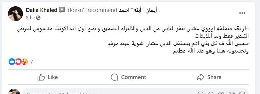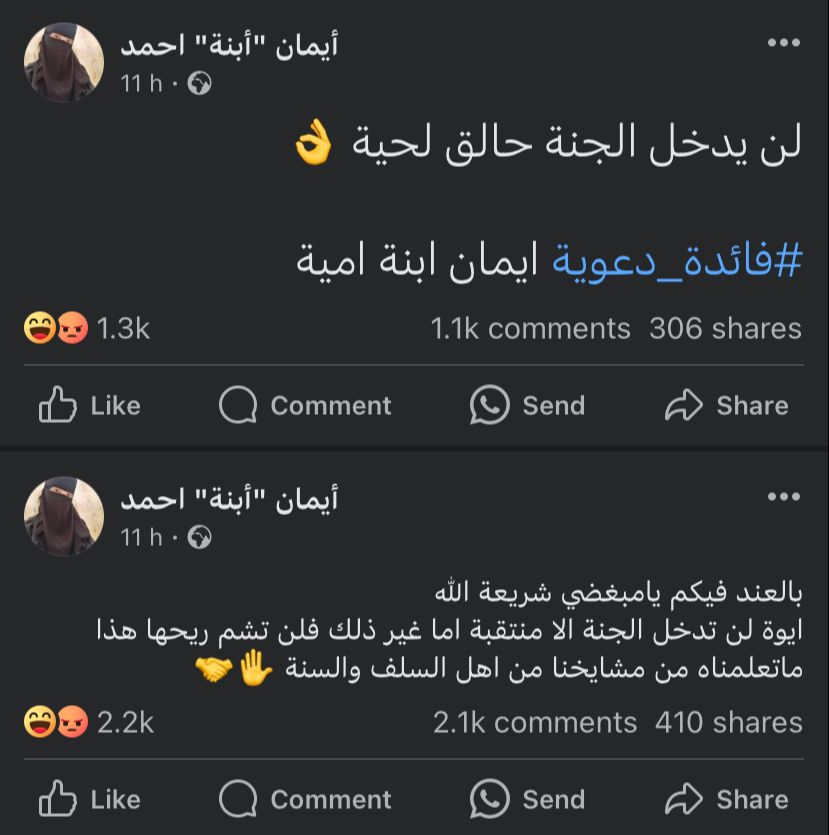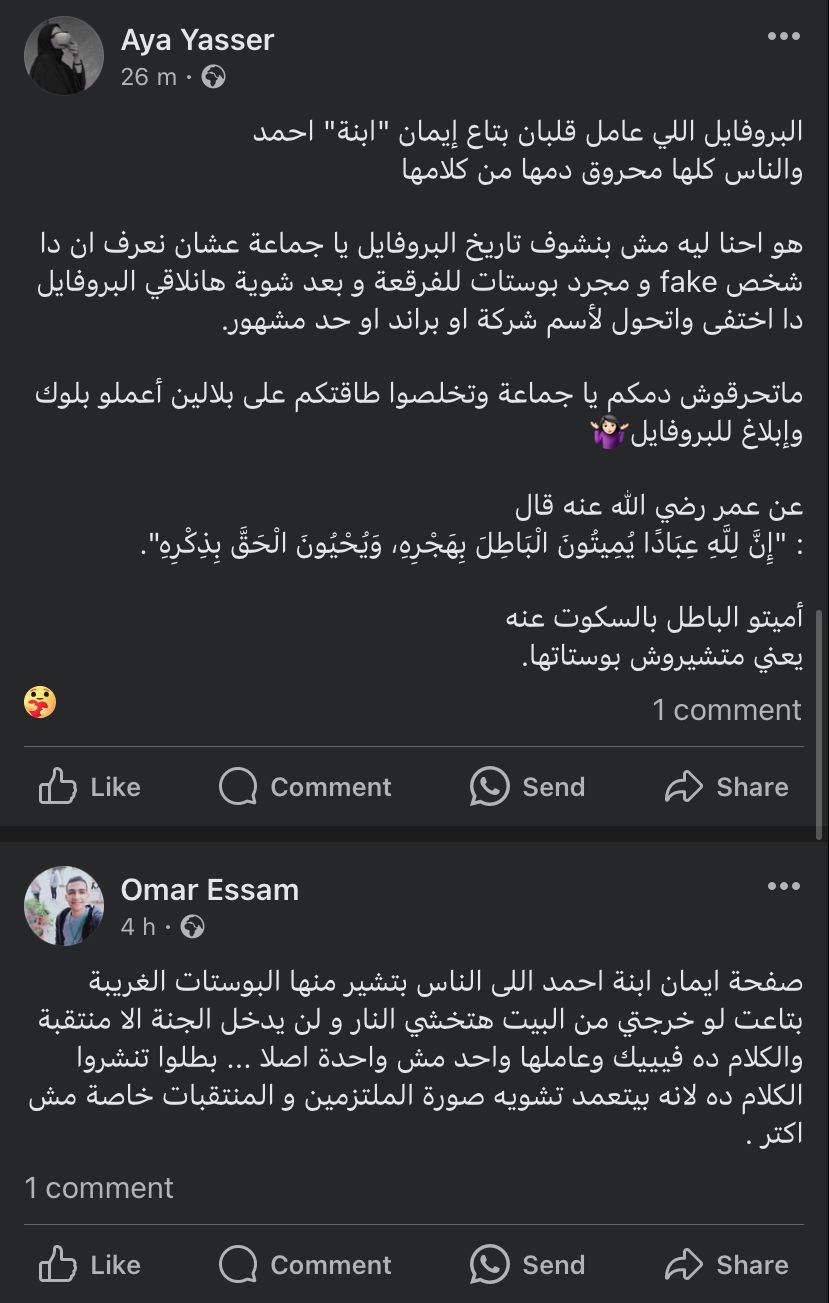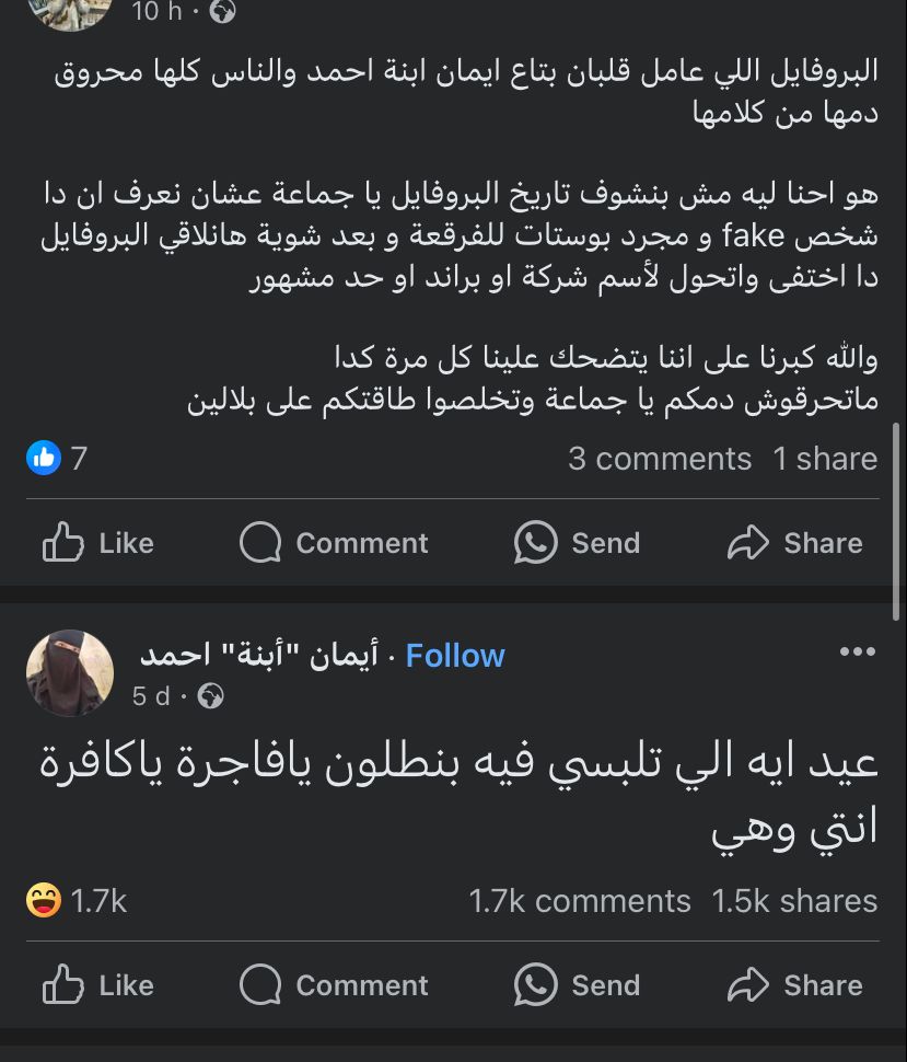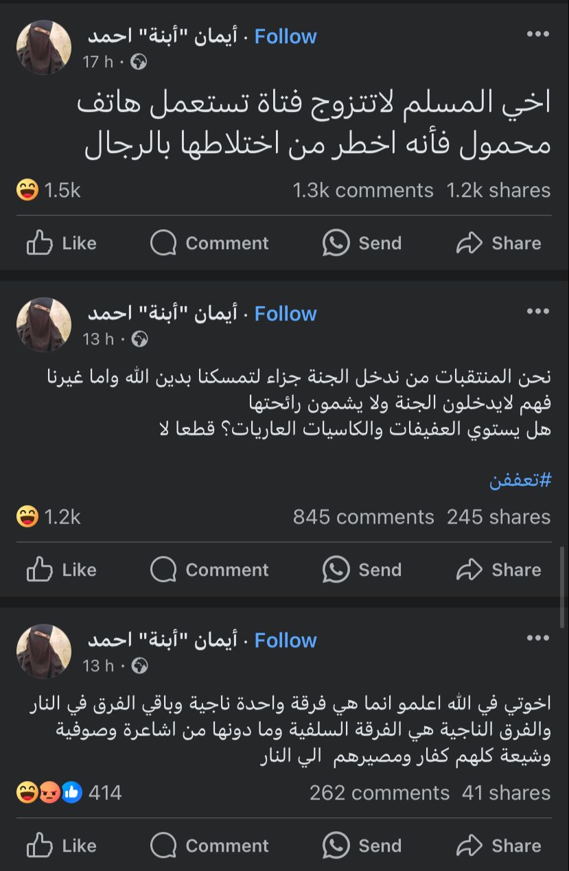 ونشرت أكونت إيمان ابنة أحمد، منشورًا آخر،. حيث كتبت: أخي المسلم لا تتزوج فتاة تستعمل هاتف محمول فإنه أخطر من اختلاطها بالرجال، لأي بنت خرجت من بيتها في العيد مبروك عليكي حبيبتي مش هتشمي ريحة الجنة.