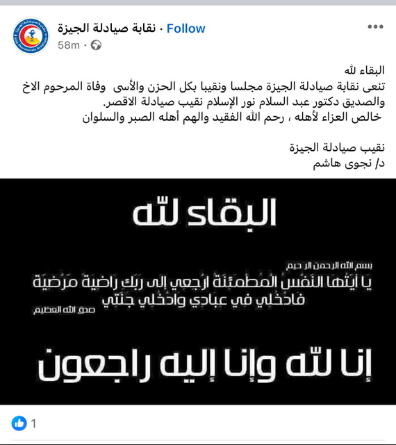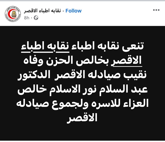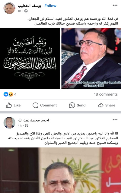 وتحولت صفحات موقع التواصل الاجتماعى فيسبوك، إلى دفتر عزاء، لنعي الدكتور عبد السلام نور نقيب صيادلة الأقصر، حزنا على الفقيد داعين له بالرحمة والمغفرة.