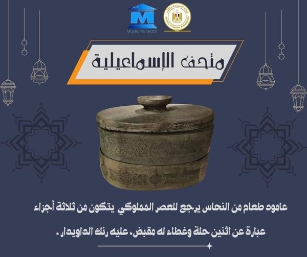 يعرض متحف آثار الإسماعيلية بعد الانتهاء من عملية ترميمه، على مجموعة متنوعة من أدوات المائدة المتنوعة من عصور مختلفة من بينها عامود طعام من النحاس يتكون من 3 أجزاء عبارة عن اثنين حلة وغطاء له مقبض.